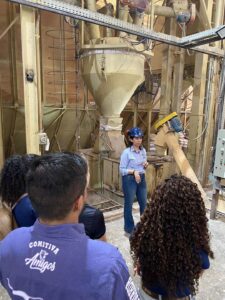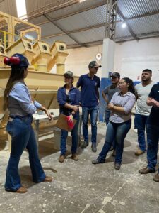 Uma das paradas cruciais foi no setor do premix, onde abordamos a necessidade de produção separada para atender às demandas específicas de animais ruminantes e monogástricos. Através de demonstrações práticas, os estudantes puderam visualizar os equipamentos utilizados na moagem e pesagem dos grãos, compreendendo sua importância no fluxo de produção.